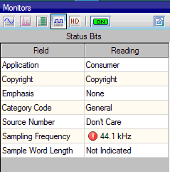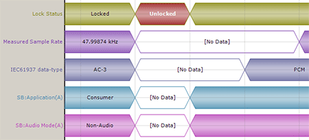 ___________________________________________ 将元数据与实际音频进行比较 APx 元数据监视从被测设备接收元数据值时解码和显示元数据值。一台显示器处理 HDMI 音频 InfoFrame 数据,另一台显示器显示通道状态和用户位。两个监视器还显示实际测量的输入采样率。当仪器接收杜比和 dts 信号时,它还会显示 IEC 流类型、ACMOD/AMODE 值、对话框规范化级别和比特率。 指示的元数据与实际接收的流之间的差异将自动识别和标记(例如,如果输入采样速率为 48kHz,但通道状态指示该数据应为 44.1kHz)。