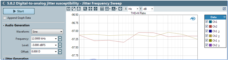 APx 抖动分析仪通过频率滤波和单位选择(秒或 UI)测量抖动。APx 输入配置支持具有高通、低通、加权和均衡的抖动测量滤波。