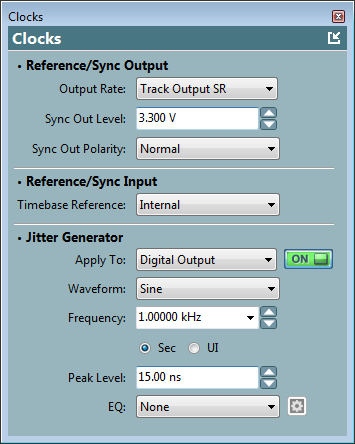 APx 抖动发生器提供以秒或单位间隔为单位的抖动振幅控制、波形类型(正因、方形或噪声)、频率和源(应用到)。抖动发生器振幅按峰值电平(以秒为单位或 UI 为单位)进行校准。
