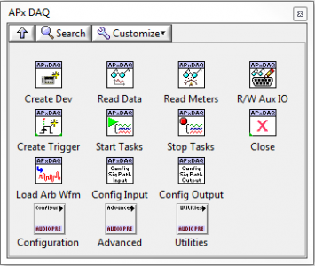 该驱动程序在开发时考虑了广泛的信号采集应用,简化了APx515分析仪作为基于LabVIEW的测量环境的健壮、高质量前端的集成。将APx515轻松添加到LabVIEW环境中是通过DAQ驱动程序的虚拟仪器(VIs)集合实现的—在LabVIEW中创建的一个功能或程序,用于初始化硬件和配置广泛的设置,包括输入和输出通道、采样率、触发条件、信号生成,以及信号采集。该驱动程序基于一个低级别C++测量库,遵守国家仪器仪表驱动程序的标准指南,并且具有非常小的内存占用。此外,它使APx515的控制完全独立于APx500控制软件。图1显示了DAQ驱动程序菜单面板上的顶层VIs,可从LabVIEW中的Instrument Driver子面板访问。