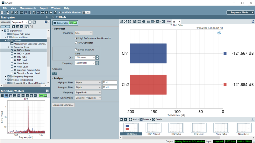 工作台模式和序列模式从根本上处理音频样本不同。在序列模式下,大多数音频测量是频域处理的结果。即,采集音频数据,应用傅里叶变换,然后根据需要通过对FFT二进制数进行求和与分割来提取结果。在工作台模式下,音频测量通常是时域算法的结果。也就是说,我们的分析仪对来自模数转换器的原始瞬时音频样本进行计算。