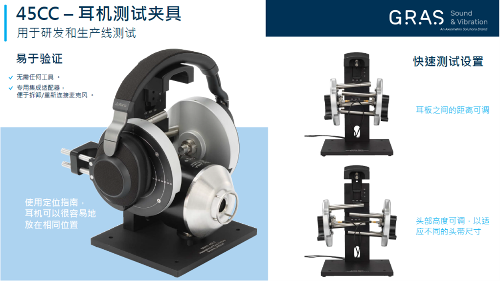 GRAS Sound & Vibration的业务开发副总裁Niels Kjærgaard说:“长期以来,制造商一直需要协调在研发和生产过程中的测试。45CC系列在测试市场上广受欢迎,我们为满足耳机和头戴耳机制造商不断增长的需求,提供了一种高性价比,多功能的测试夹具,使研发和生产工程师开发测试设计的同时, 在生产线中能验证和调整这些测试, 以确保整个生产链测试的一致性。“