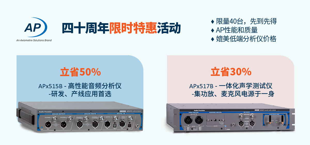 为了庆祝这一重要的里程碑,我们特别推出四十周年庆的系列优惠活动。首期重磅折扣包括我们两款超高性价比产品,一款是研发、产线应用首选的APx515B