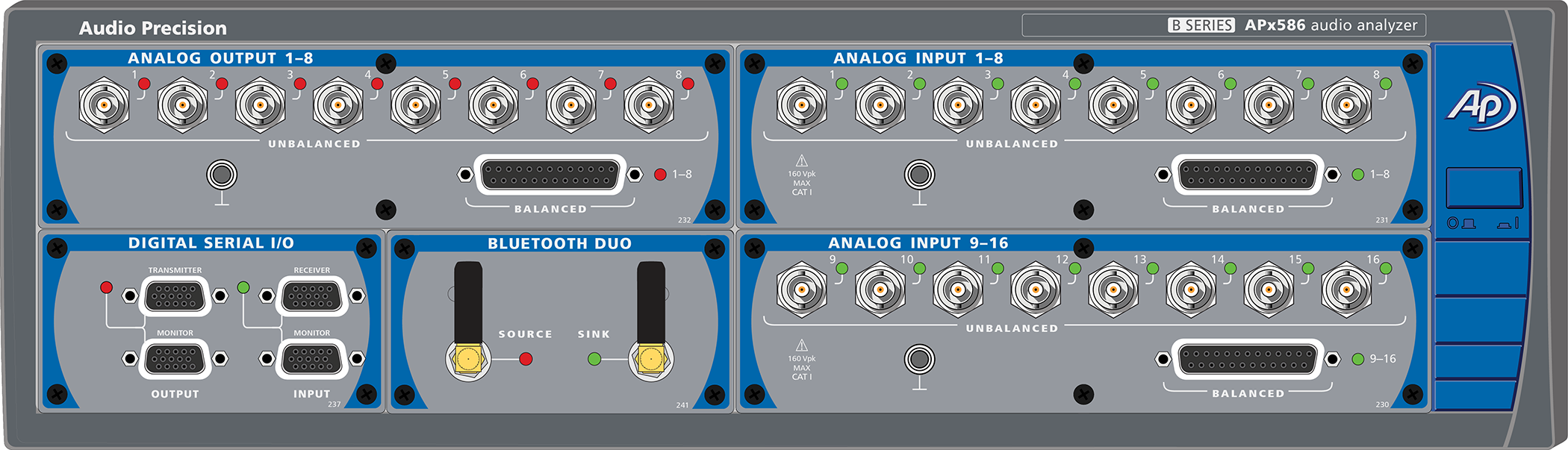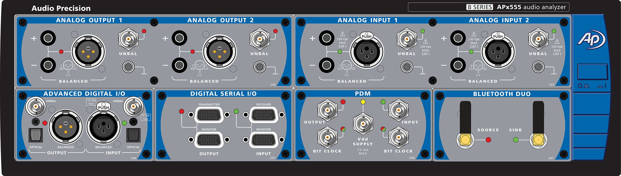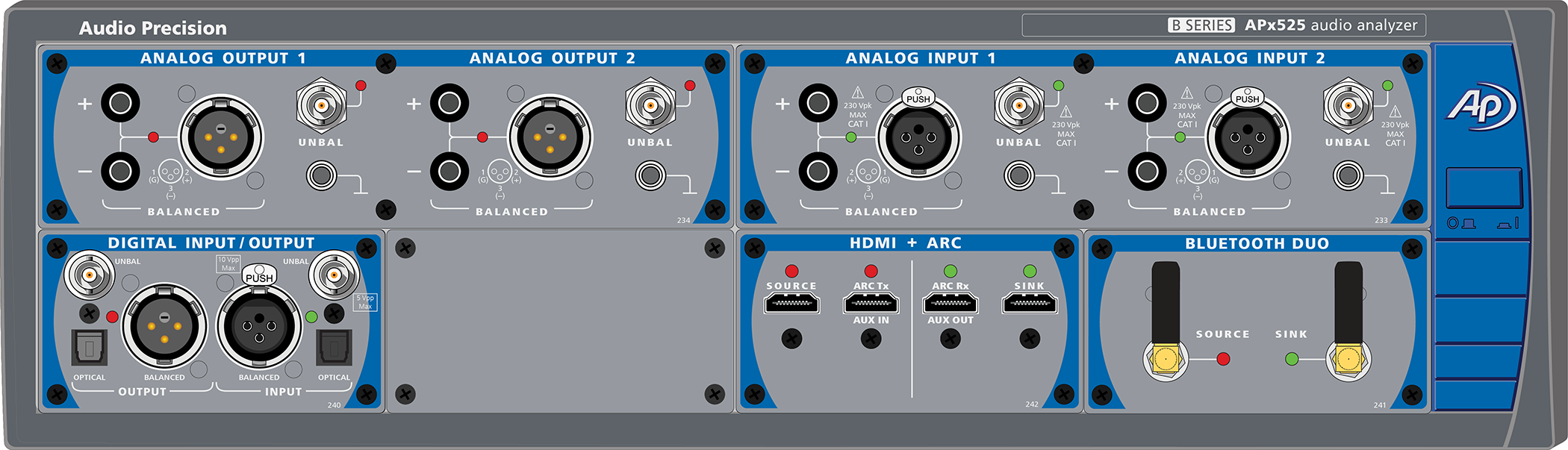 每个 APx500B 系列音频分析仪都有高精度的模拟音频输入和输出, 除 APx511B 外, 通过 AES/EBU, TOSLINK和 SPDIF.包括216k 数字输入和输出。此外, I/O 还可扩展到 APx555B、APx52xB 系列和 APx555B 系列分析仪, 可选数字串行、带有 ARC, PDM和蓝牙模块的 HDMI。最后, 高级主时钟 AMC 模块处理输入和输出时钟信号, 使配备 AMC 的分析仪与外部设备同步