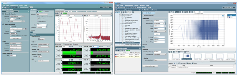 在台架模式下, 为用户提供了一个可配置的发电机和分析仪、一个广泛的仪表系列、一个全面的扫描引擎、一个时间记录仪和 APx 信号分析仪、连续扫描和声学响应测量的实现, 所有这些都可以提供更大的灵活性, 可实时查看设备行为。